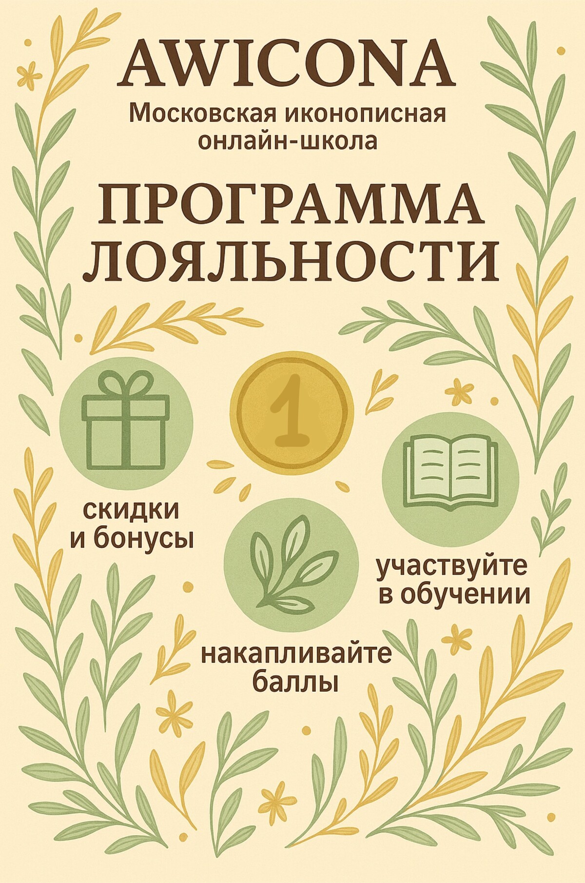 В нашей школе мы ценим труд каждого ученика. Ваше усердие, любовь к иконописи и стремление к духовному росту заслуживают признания. Именно поэтому мы запускаем Программу лояльности Awicona, которая сделает ваше обучение вдохновляющим процессом с приятными бонусами.